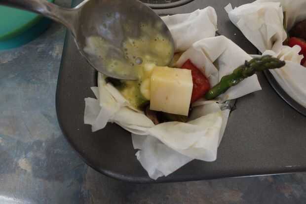 Llene cada vaso con verduras, deli/tocino/jamón crudo, coloque en el queso.