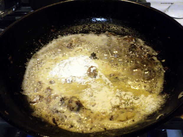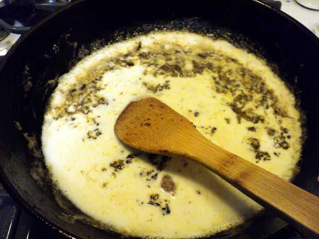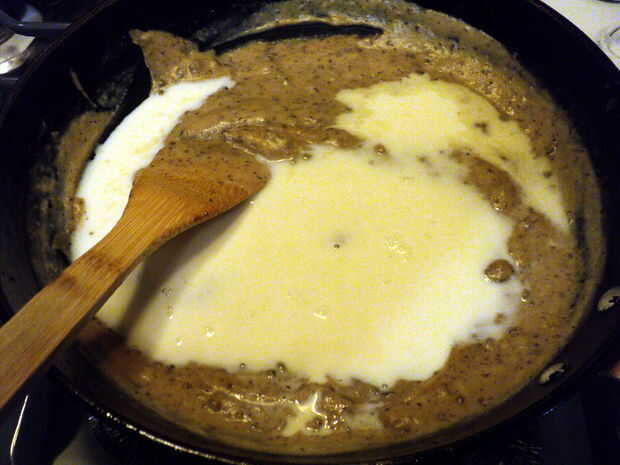 Cuando la harina se obtiene estén dorada lo es hora de agregar en una taza o dos de leche o crema. Agregar en cualquier stock de carne si lo tiene.