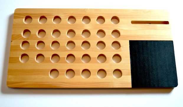Tengo una gran abundancia de alisos en mi tienda y decidió que haría que. Aliso es una madera ligera buscando agradable, que es lo que quieres en un escritorio móvil. Pensé que una manera de hacer que se vea más fresco ser pegamento para arriba como un tablero de corte de borde grano y tan pasado que tuve dos tonos ligeramente diferentes de aliso que yo podía alternar en un patrón de la raya. Las dimensiones de la mesa son 22.5″ L 11.5″W y espesor de 3/4. Hay siete filas de agujeros a través de la Junta y cinco orificios en las primeras dos filas hacia abajo y seis en las próximos cinco filas. Ajuste del recorte para la alfombrilla del ratón a uno que tenía y la ranura para el I pad es 5.5″ x. 5 pulgadas de profundidad.