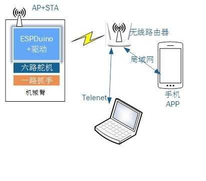 Brazo de robot DoArm se muestra en la figura 2. Brazo robot es controlado por la Junta conducida por el WiFi entre ESPduino y router y ESPduino. De esta forma, brazo robot puede controlarse con la aplicación o la PC en el teléfono móvil.
