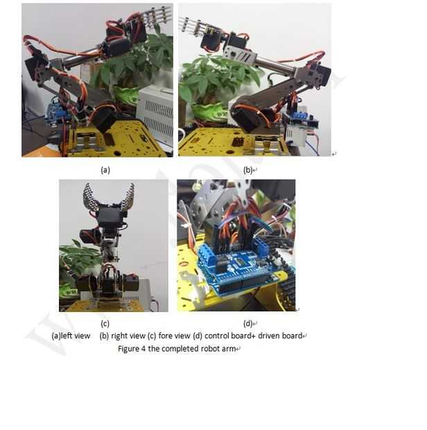paso, debemos instalar el kit de developbaord de ESPduino. Luego, deje que el cable de extensión de servo conectar a la tarjeta por. Si el cable de extensión de servos no es demasiado largo, puede conectarse por cable de dupont e inserte la Junta. Ciertamente, podemos asignar el canal al azar, el puede decidir el canal de ajuste por el programa. El brazo del robot móvil terminado se muestra en la figura 4.