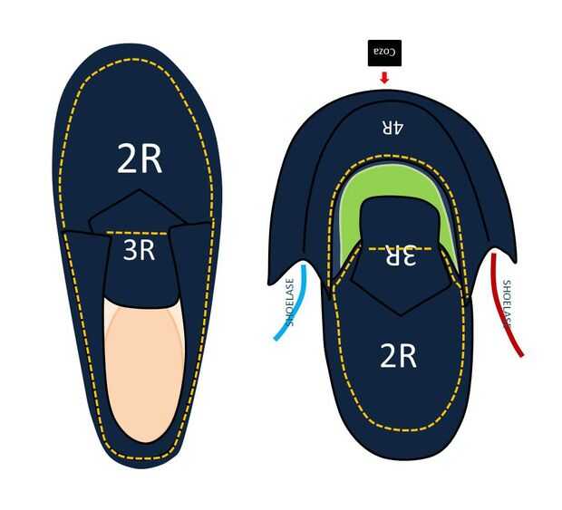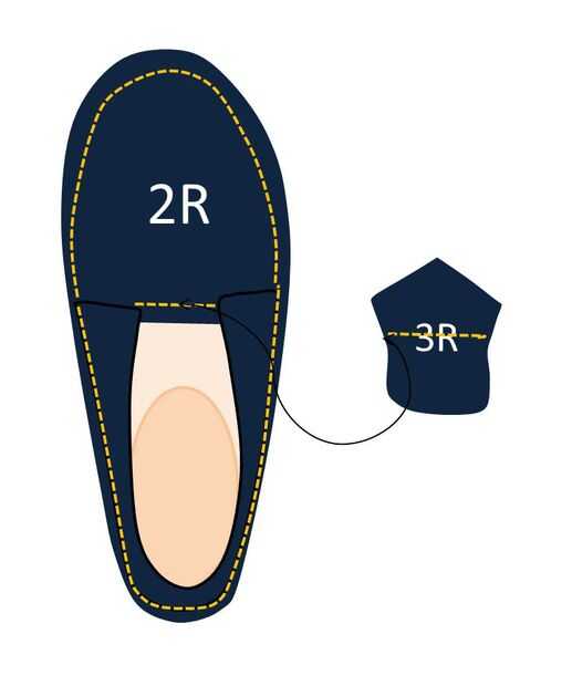 Ahora es el momento para fijar la lengua, hacerlo como se ve en la imagen, colocar en el centro del puente de la pieza 2 y coser con un punto de costura simple, hacer un nudo y corte el hilo. (Primera imagen)