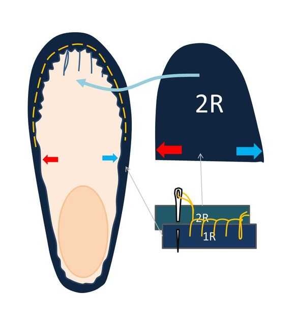 Coloque la pieza 2 sobre el pie y dentro de la pieza 1 como se muestra, pieza 1 debe mirar siempre hacia fuera el mocasín porque de lo contrario las fronteras de enfocar podrían hacer heridas en los pies cuando utilizas tus mocasines.