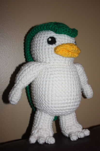 Esta pieza de amigurumi está basada en un personaje de la serie de TV antigua Monster Rancher. Mocchi es una criatura que se asemeja mochi, sweetcake Japon hecho de arroz machacada. Tiene piel lechosa suave y una hilera de escamas de concha en su espalda.