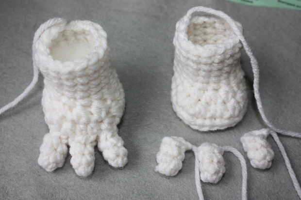 Se necesita dos piernas y los pies hechos de hilo blanco. Cada pie tiene tres dedos de los pies separadas que se hacen y se agregan a la parte delantera del pie. Hacer seis dedos del pie, después hace la sección del pie o pierna. Coloque tres dedos del pie en la parte delantera del pie usando las colas de los dedos del pie. La cola en las patas se utilizará más tarde para unir al cuerpo.