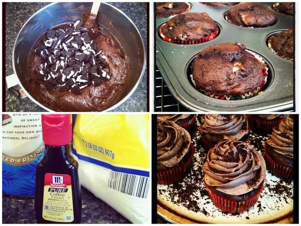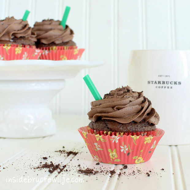 Mientras que los cupcakes están enfriando, vamos a mezclar la crema de mantequilla. En un tazón bate 1/2 taza de mantequilla (Ablandada), 1/2 taza de manteca, 1/8 cucharadita de sal, 1 cucharada de café de extracto y desnatadora del Café Moka 4 cucharadas hasta que esté cremosa. Tamizar juntos oscuro 1/4 taza cacao en polvo con azúcar 4 tazas en polvo. Lentamente, añada a la mezcla de mantequilla hasta que todo se incorpore. Batir por otro minuto o hasta que esté cremosa. Usar decorar bolsas y punta 27 para cupcakes por las heladas. Espolvorear con 1/4 taza trituradas las migas de galleta de chocolate. Decorar con un divertido paja. Esto hace que unos 30 cupcakes. (Si te gusta el frosting para ser muy grueso, doble todos los ingredientes de la crema de mantequilla).