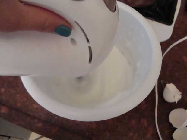 -Bata las claras de huevo, agregue azúcar y bata como un merengue.