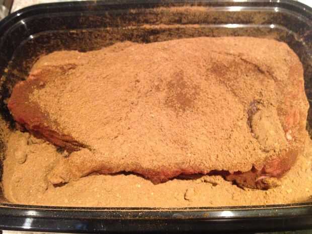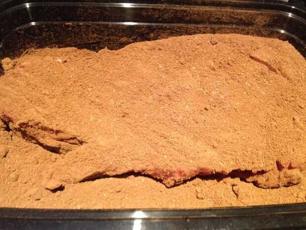 Antes de frotar la carne, me asoman un par de veces con un tenedor por ambos lados y luego añadir la carne a la frotación. Cubrir ambos lados bien y deje reposar a temperatura ambiente durante una hora.