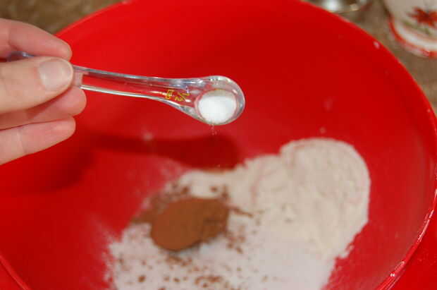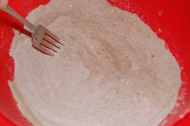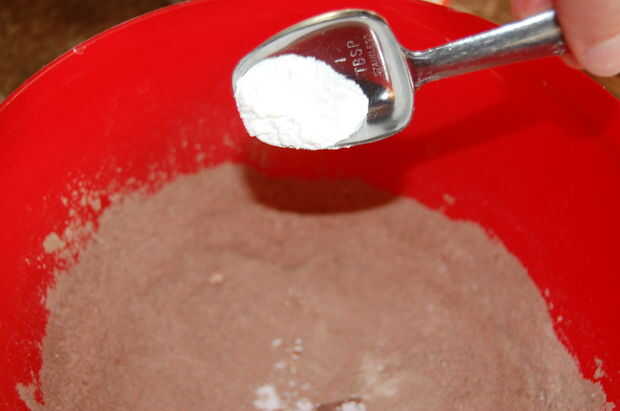 Añadir la harina, 1 cucharada de cacao en polvo, 1 sobrecito de café instantáneo, azúcar blanca, polvo de hornear y sal en un bol. Mezclar bien.