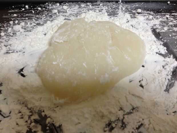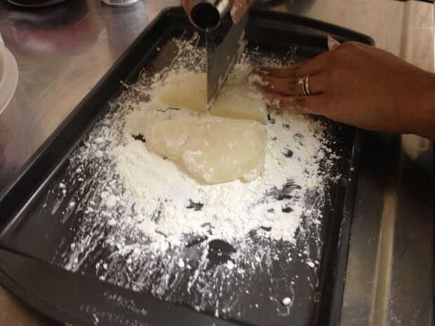Espolvoree maicena sobre el mochi, cuchillo de corte y también las manos (almidón de maíz ayuda a evitar que el mochi está demasiado pegajosa)