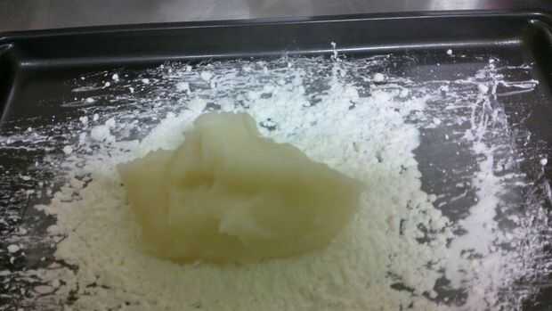 Con el almidón de maíz, extender en un plato grande o superficie de trabajo y sacar el mochi en la parte superior (su muy caliente así que tomar PRECAUCIÓN)