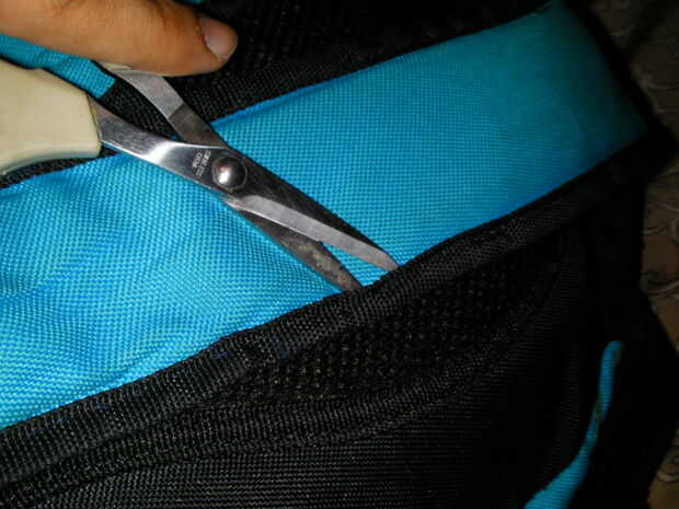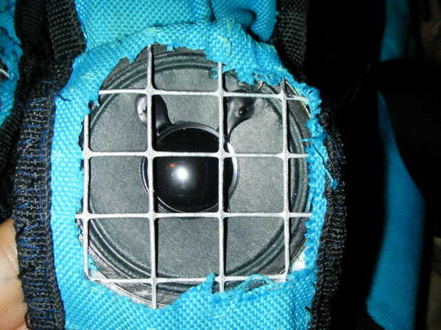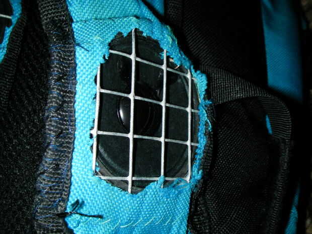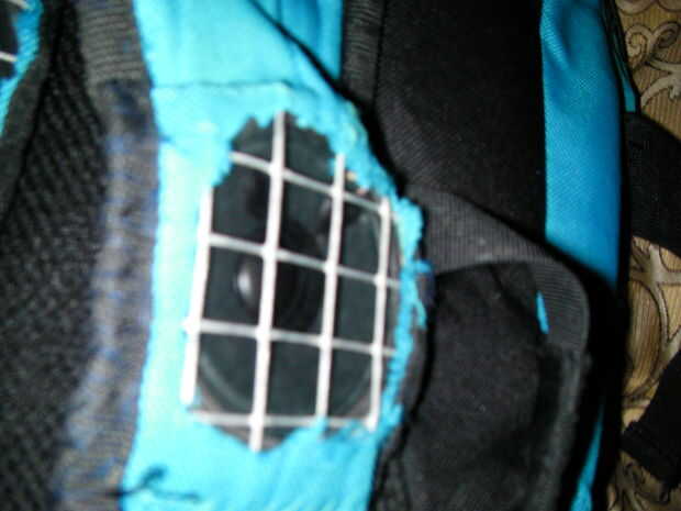 después de hacer esto vamos a placeing los parlantes en su lugar que le corresponde. averiguar dónde a colocar los altavoces en su mochila. tomar en cuenta donde se encuentra el orificio auricular en tu mochila si lo tiene y donde hay doble es capas de malla tan el arnt de altavoces se indica en el interior. también tener en cuenta donde mantener tu amplificador. mina guardo en un bolsillo debajo de la cremallera principal. vamos a empezar con las correas. separar el enlace externo negro que mantiene unida a la correa. imaginar la ubicación de los altavoces para que cuando llevan la mochila, el orador será adecuado por la cabeza. una vez que encuentre un buen lugar, cortar un "+" Dónde está el altavoz. los cables va a correr encima de la correa en la parte superior de la mochila. después de placeing del altavoz, corte cualquier material extra que la cubre y formar alrededor de los altavoces. comenzar a coser el material de la correa con el fenceing del altavoz. se trata de cómo se sostenga el altavoz en su sitio.