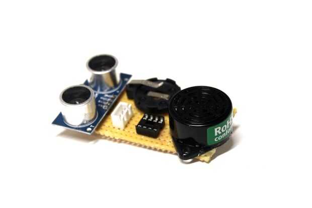 Ahora que tienes una idea de qué va dónde, calentar el soldador y soldadura de la HC-SR04 titular de célula tipo moneda, zumbador, conector hembra 2,54 mm y zócalo DIP de 8 pines para el perfboard.