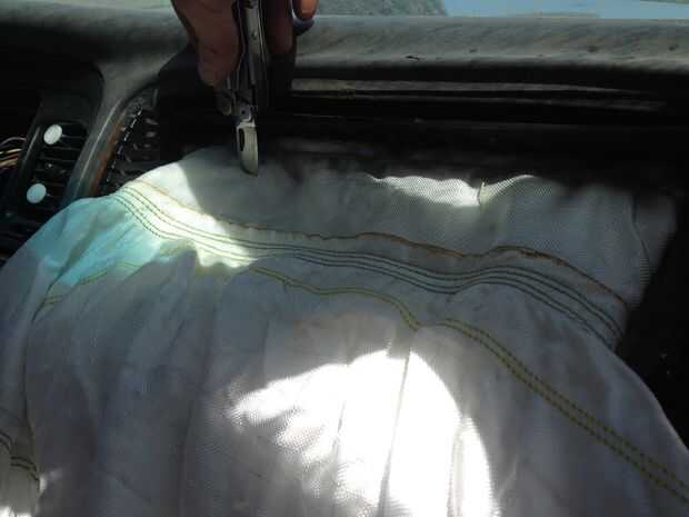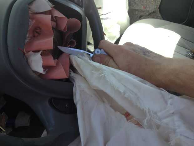 Una vez que encuentre un coche que ha explotado las bolsas de aire se necesita un cuchillo afilado para cortar hacia fuera. Usé un cuchillo con una lámina aguda para esto pero supongo que una afilada navaja trabajaría demasiado. Cortar lo más cerca del lugar donde se une la bolsa de aire como sea posible para conseguir como mucho tacto en tejido como sea posible.