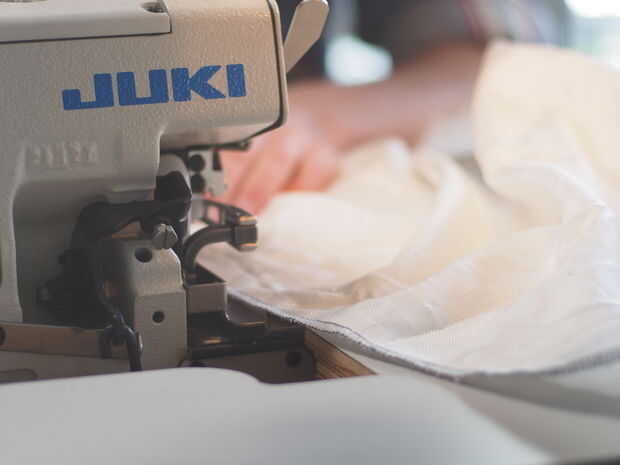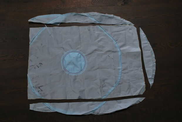 Cuando se trabaja con tela reciclada a menudo es necesario coser piezas pequeñas en trozos más grandes. Lo hice con la remalladora industrial y una máquina de coser normal haría el truco. La bolsa tendrá cuatro piezas que son 24 por 32 pulgadas de la forma general de la bolsa, así como dos que son aproximadamente 20 por 6. Pude conseguir todas las piezas de tres bolsas de aire, uno del lado del conductor y dos del lado del acompañante.
