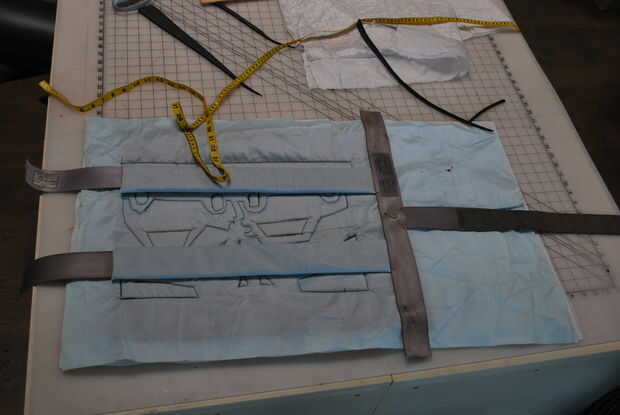 El primer panel es el único con las correas de la mochila y la mitad de la hebilla para el cierre. También decidí coser un esbozo de un accidente automovilístico en el panel para la decoración adicional y para mantener la espuma en lugar.