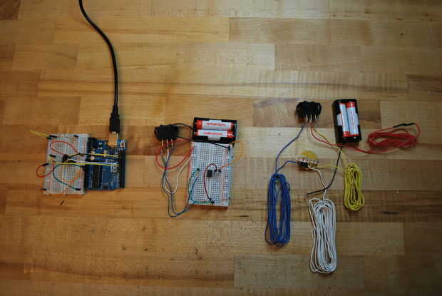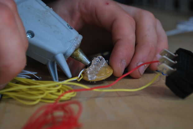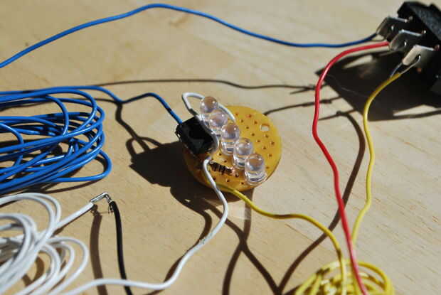 He decidido añadir algunas luces LED integradas a la bolsa con cables integrados y un interruptor. Usé un Arduino para programar un microcontrolador pequeño llamado un ATtiny con un patrón de parpadeo personalizado. Después de prototipos el circuito en un protoboard yo había soldado cinco LEDs y el resto de los componentes necesarios para una pequeña tabla con todos los componentes.