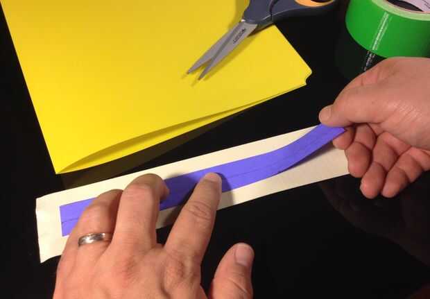 1. Coloque la tira de papel sobre el lado adhesivo de la cinta del conducto, a lo largo de la línea central. Allí deben ser aproximadamente iguales cantidades de adhesivo expuesto por encima y por debajo de la tira de papel---se trata de la carpeta a la carpeta.
