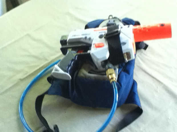 esto es algo realmente fresco y fácil de hacer si tienes una super soaker máximo 6000... solo abrir se saca el recipiente del agua y la punta de la nozzel, hacer un agujero más grande en el secundario nozzel luego suba poner dardos en cada extremo...