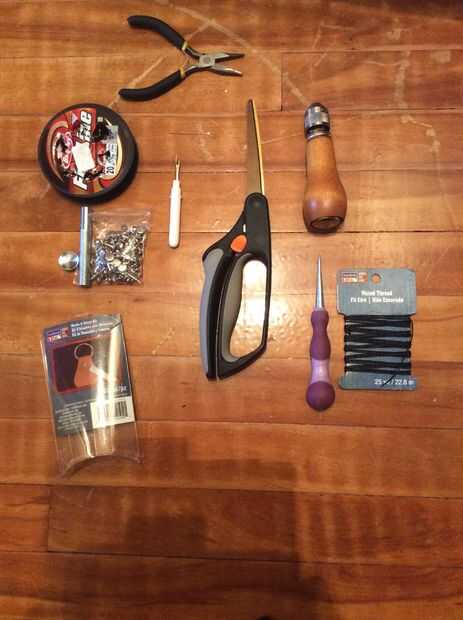 De cuero remaches, martillo y yunque (en la tienda encontré un kit para alrededor de $8) y...