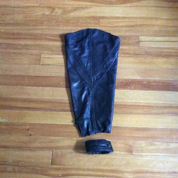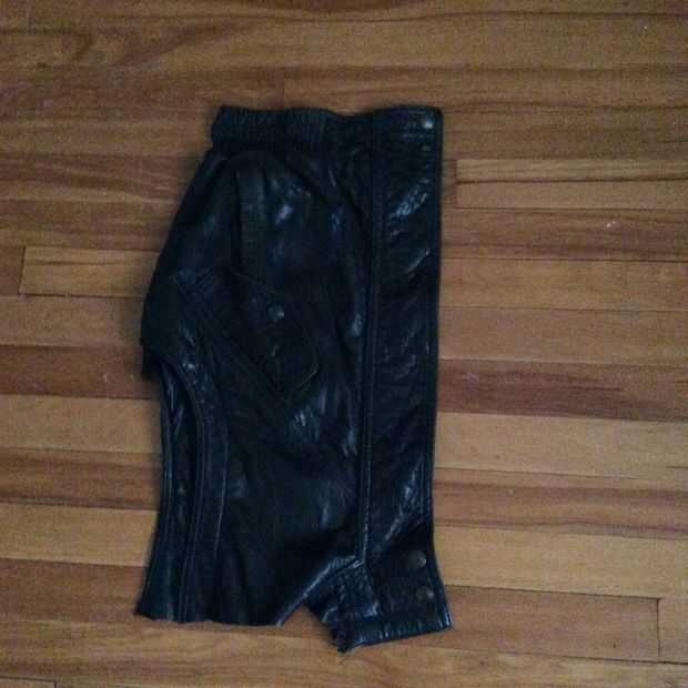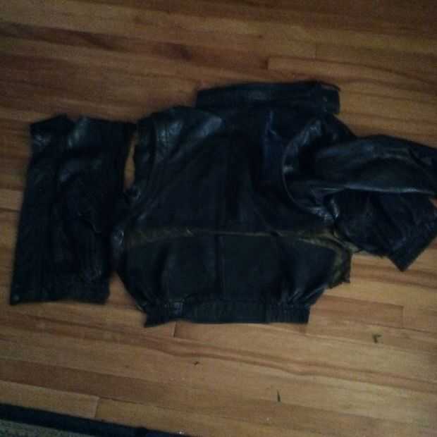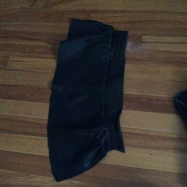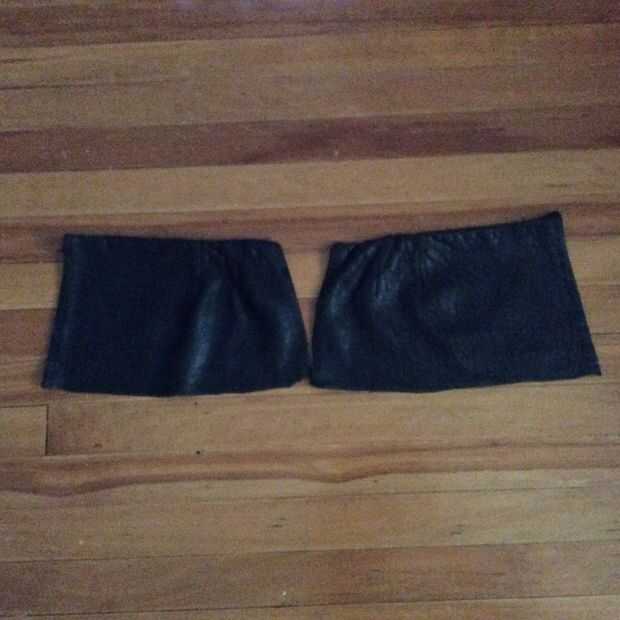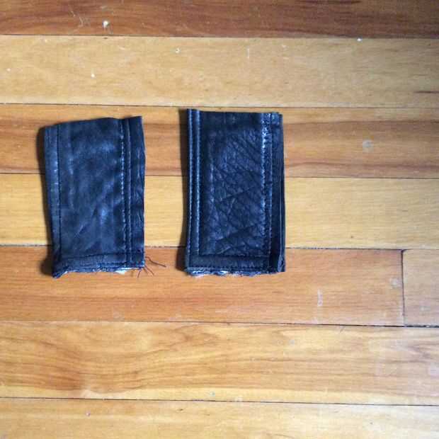 Las siguientes dos piezas que desea hará que los lados de la bolsa. Qué vas a hacer es voltear la chaqueta para que buscas en la parte posterior de la chaqueta. Luego va a cortar o rasgar la parte inferior de la espalda de la chaqueta de la costura. Para mí esto era el derecho de área sobre el elástico, pero por debajo de la costura que corriendo horizontalmente alrededor de un tercio de la parte inferior de la chaqueta. Usted también necesitará cortar esta pieza a los lados, cuanto más mejor así hasta que se ejecuta en una costura, debe ser donde está el doblez si la chaqueta tiene la espalda apoyada en su frente. Una vez que tengas esta pieza vas a disecar verticalmente justo por la mitad así que terminas con dos rectángulos de cuero iguales.