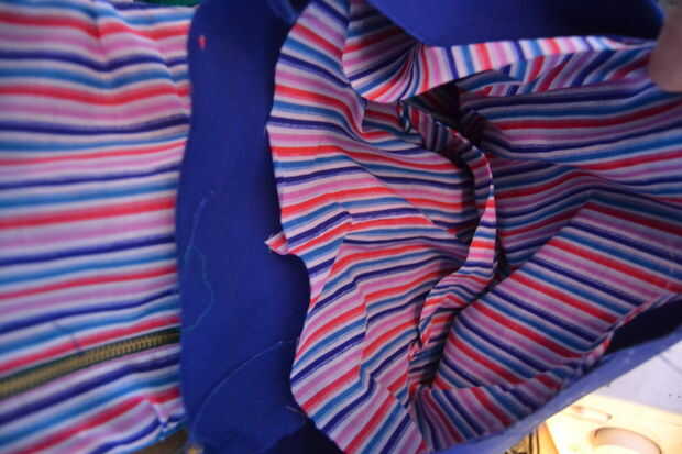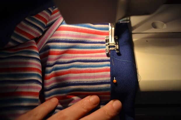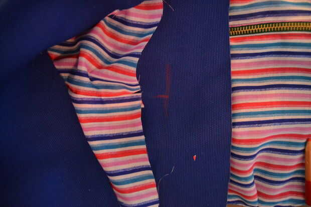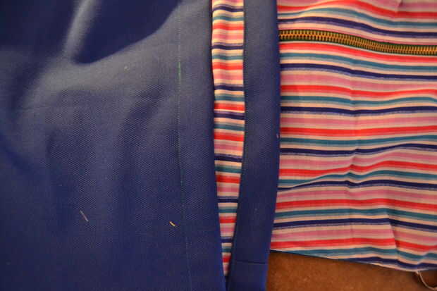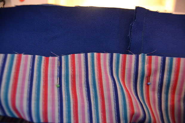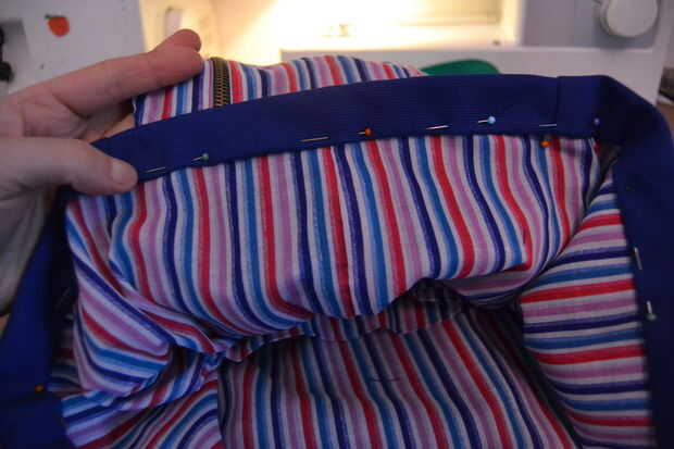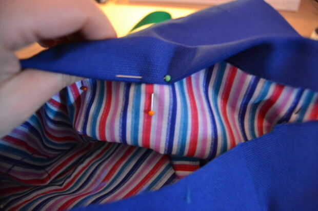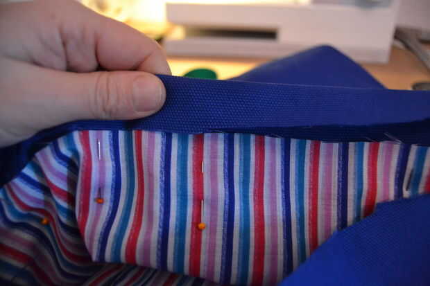 poner la parte del forro en la parte exterior, la costura posterior del revestimiento debe alinearse con el centro de la pieza posterior. el exterior es 5 cm más largo que el revestimiento. fijar el forro con los pernos como se muestra en las fotos. a continuación doblar la parte del exterior que es 5 cm más de largo 2,5 cm para el interior y entonces otra vez 2,5 cm. coser.