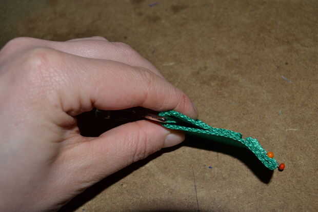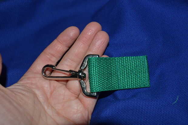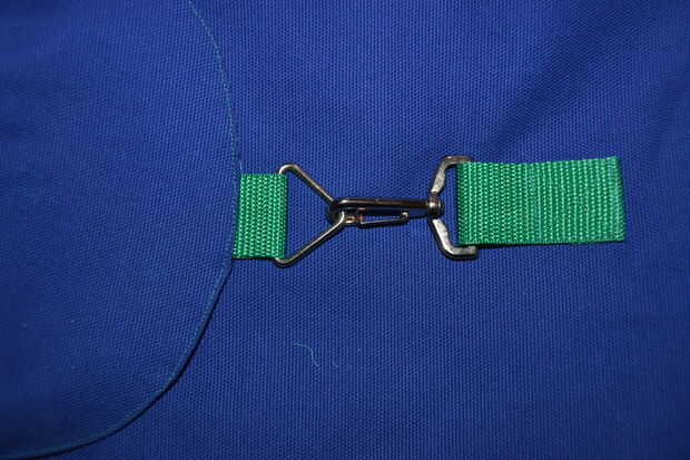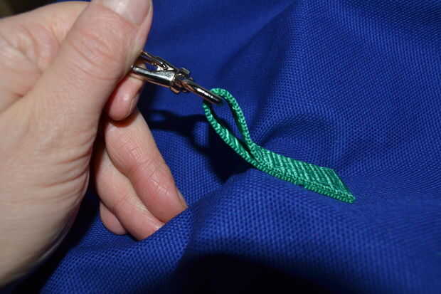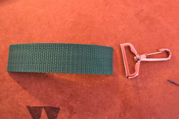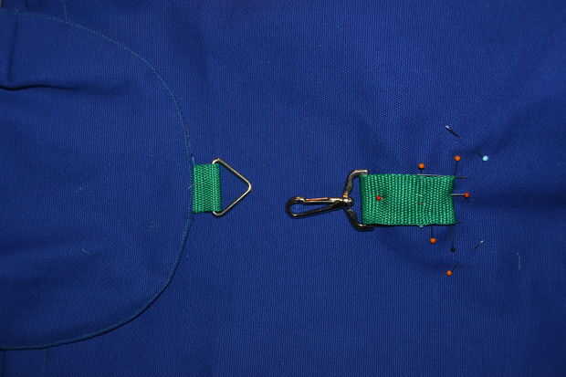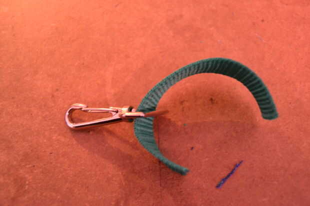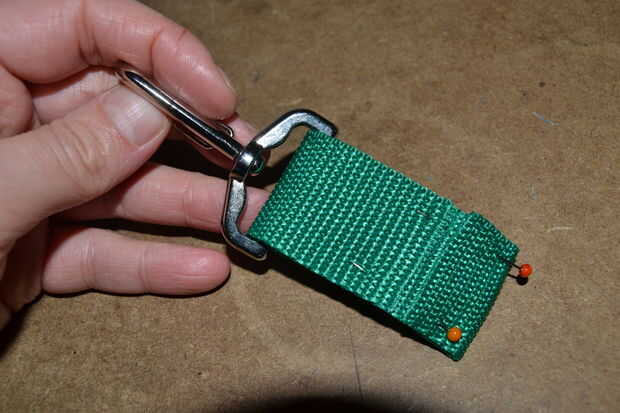 Tire de la correa de la correa por el mosquetón y formar un bucle. Presione el lazo plano y fijar con alfileres. Asegúrese de que la parte del bucle donde se unen los 2 extremos de la correa es más estrecha en el extremo opuesto el mosquetón. (ver fotos)