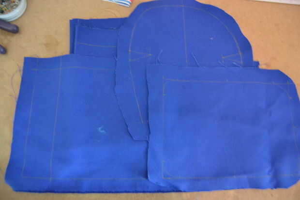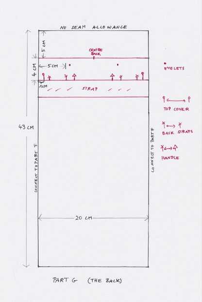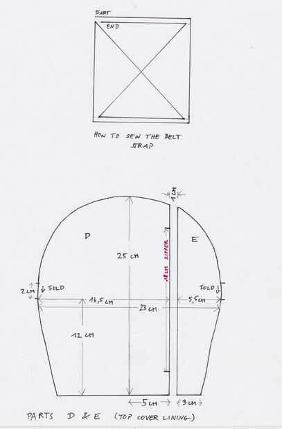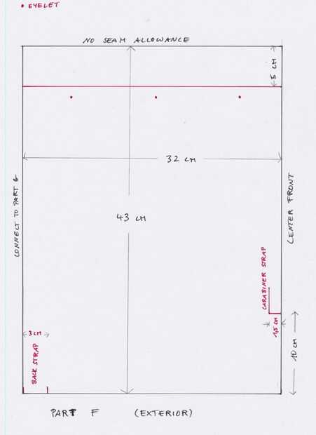 de las partes a y f se muestra sólo la mitad, tienes el scematic a lo largo de la línea de frente de centro del espejo. marca todas las líneas dentro de las partes (rojo en la scematics) así como usted necesita en el proceso de las piezas de tela.