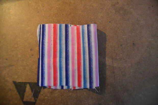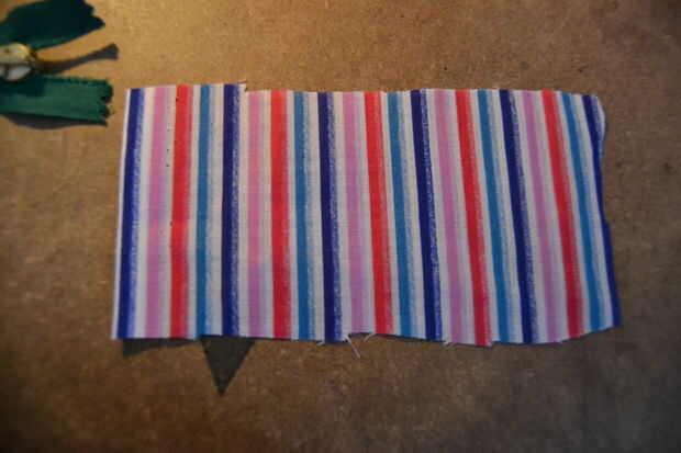 doblar los dos trozos pequeños de tela de la guarnición y doblarlas por la mitad longitudinalmente (por lo que van a estar 3 x 3,5 cm).