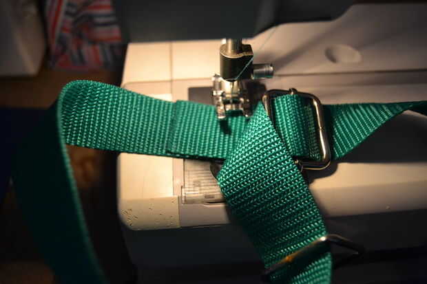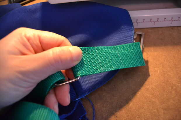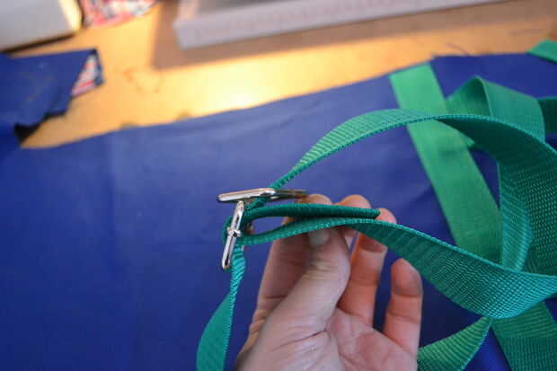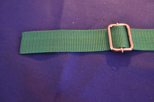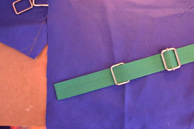 Ahora toma una de las dos correas cortas y páselo a través de la pieza rectangular y pliegan para que quede doble. coser otra plaza con una cruz de parte de unos 3 cm más bajo que el metal. la primera correa ya está terminada.