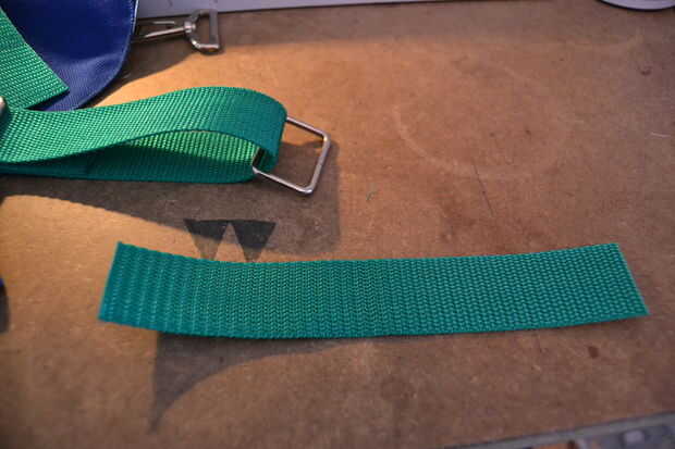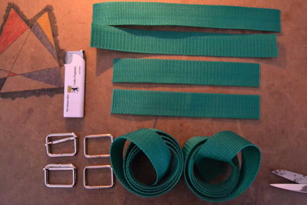 tienes que sellar uno de los bordes de cada una de las correas de la correa de 90 cm (si están hechos de plástico - si están hechas de algodón no tiene que it) hacer esto toma un encendedor y pase la llama cerca del extremo de la correa para que las fibras de plástico comienzan a derretirse, presione las fibras fundidas juntas - cuidadosamente , ya que son un poco calientes. Espero que usted puede ver la diferencia en la imagen. sólo tienes que preparar uno de los extremos de cada una de las piezas largas como esta.