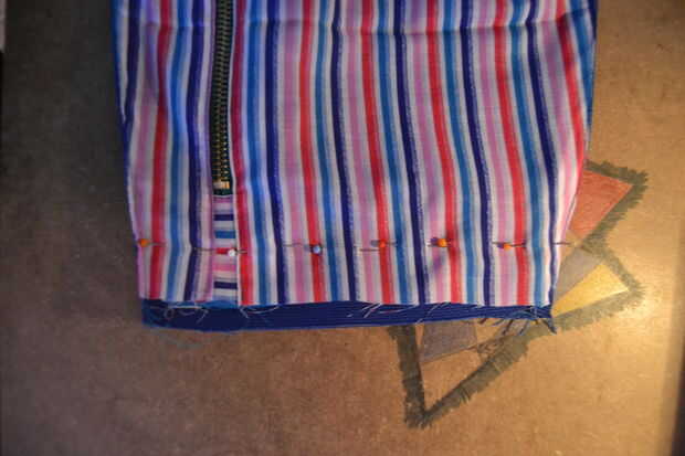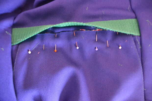 Comience con la cubierta superior. marcar la línea donde tienes que coser a la espalda con alfileres. ahora lo del perno a la parte trasera: