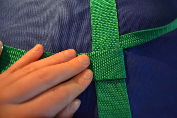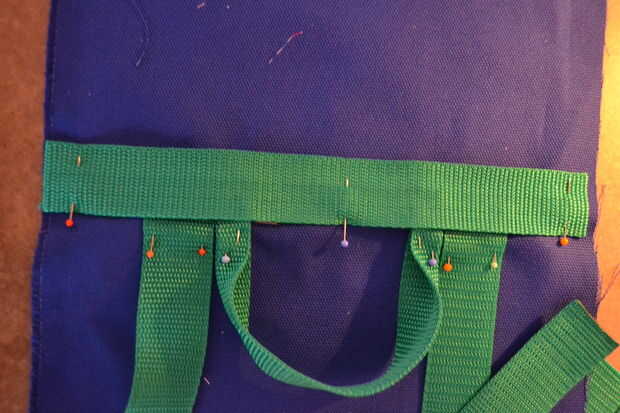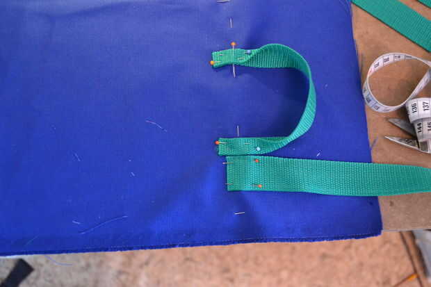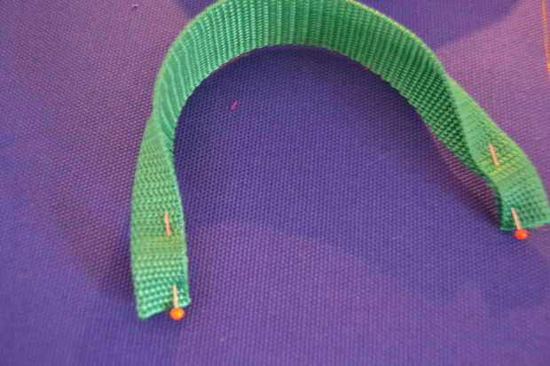la correa larga 23 cm cm será la manija. doblar ambos extremos de la correa para que la correa es doble pero la mitad de ancho y fíjelas con pasadores (ver imagen).