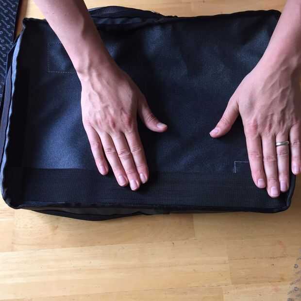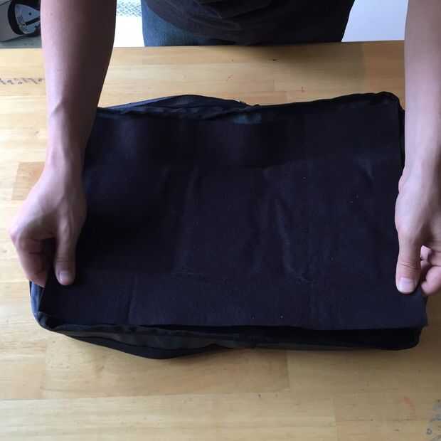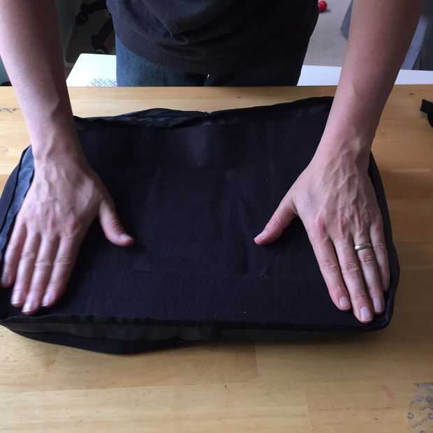 Luego vuelva la mochila y tomar una de las piezas de borde áspero y fije al borde de la mochila.