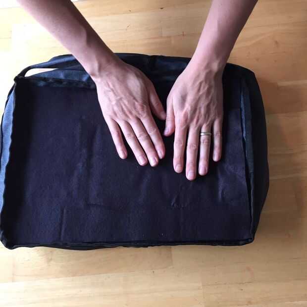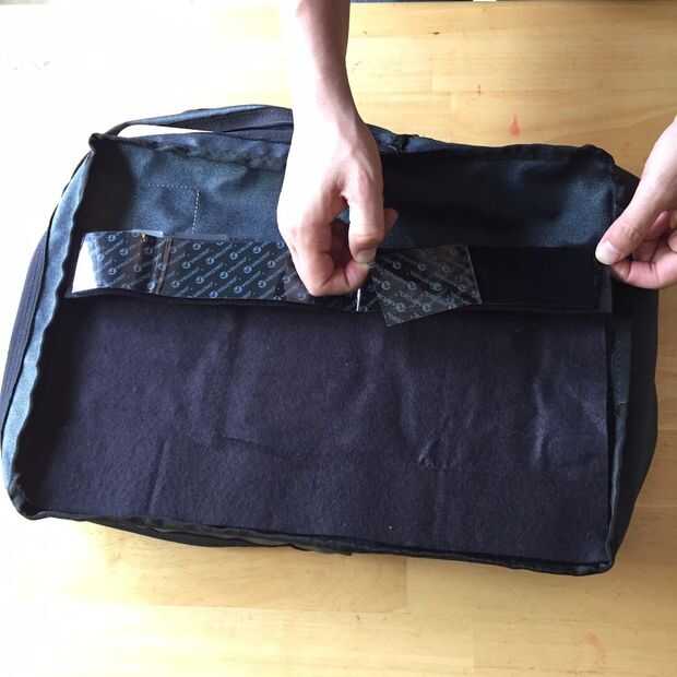 Levantar la felpa y exponer la parte pegajosa de la cinta de velcro para todos de velcro entre los paneles. Pegarlas a la bolsa con su felpa como guía.
