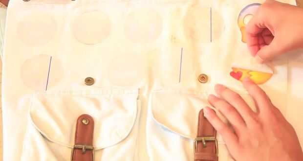 En primer lugar, dé vuelta el emojis por lo que no puede ver el frente de ellos y hierro en. Una vez hecho esto, retire el papel de transferencia de la parte posterior.
