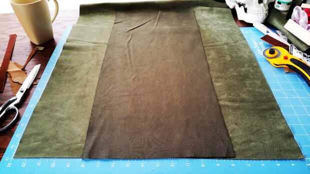 2. al llegar al borde, hacer una esquina con la tela restante del Panel frontal Exterior (Ea) y coser el lado.