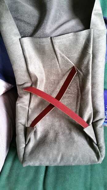3. Gire a la tela 90 grados por lo que usted está cosiendo por el lado. Coloque la correa inferior entre los paneles, para que el lado de la correa (Ee) frente a la correa inferior (Lb) es leerlo, con la diagonal de la correa hacia la parte superior de los paneles.