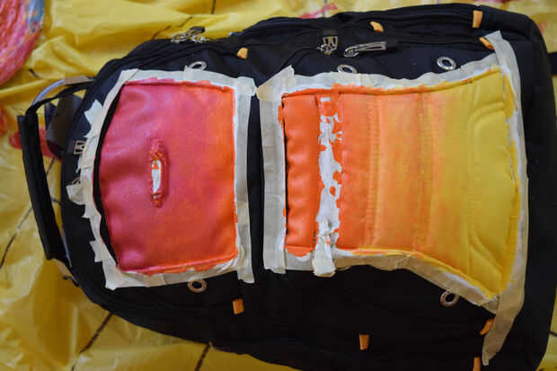 Iniciado en la parte inferior con pintura amarilla, luego pasó a través de naranja a rojo. Como se muestra en el video, yo solía pinceladas inicialmente aplicar el color, luego se superponen el color siguiente con un movimiento de arriba a abajo sponging. Utilicé un pincel pequeño cerca de los bordes para asegurarse de que el color no toca a cualquier tela que potencialmente fue descubierto por la cinta (la cinta no pega muy bien a algunas áreas).