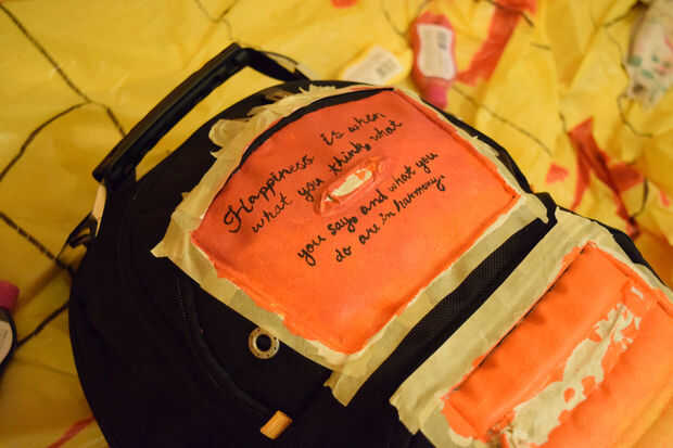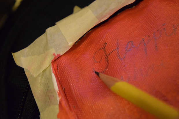 Usé mi propia letra para escribir esta frase, pero fácilmente podría basar la escritura de una fuente de computadora. Lápiz la frase en primera, utilizando trazos de luz. Aplicar las líneas finas de pintura negra sobre la cita, con un pincel fino.