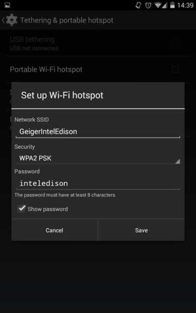 Crear un punto de acceso de red con tu smartphone, con ESSID GeigerIntelEdison y contraseña inteledison.