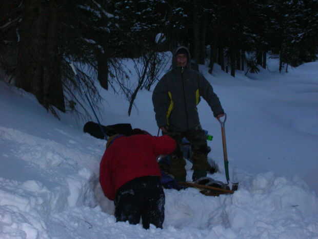 Quería construir una cueva de nieve así que leer es un montón y había decidido que debe ser bastante fácil. ¿Verdad? Bien tenemos un comienzo tardío y estaba oscureciendo cuando que elegimos un sitio, pero de todos modos comenzamos cavando dos cuevas de nieve.