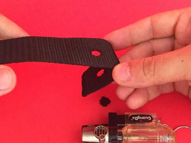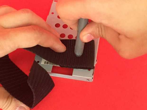 Coloque la correa de nylon sobre una superficie dura (yo usé un trozo de metal) y hacer los agujeros.