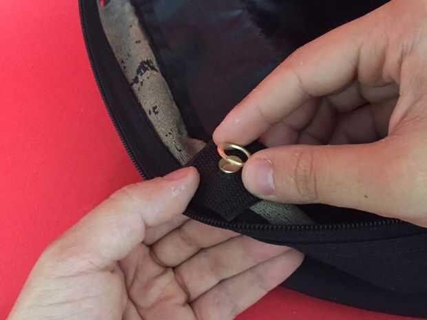 Tras el paso anterior, fijar dos ojales de latón en los agujeros previamente hechos.