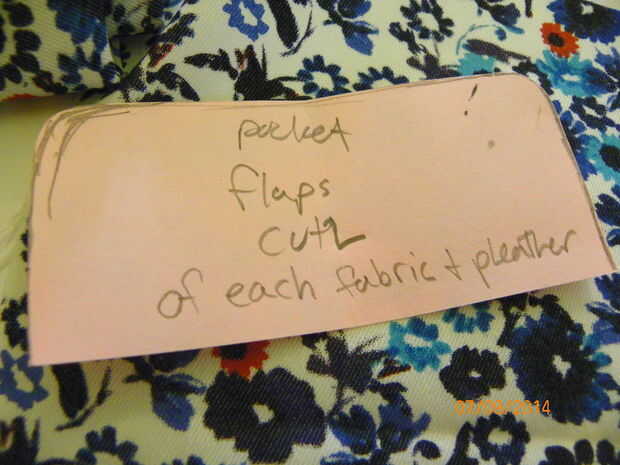 7. hacer el bolsillo colgajos sin embargo te gusta. Marca "corta 1 tela principal (o tela de la guarnición) y uno de piel artificial" hice mía en piel artificial.