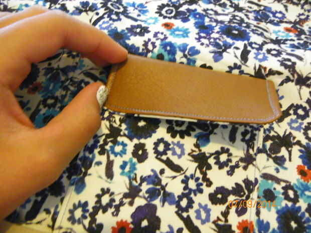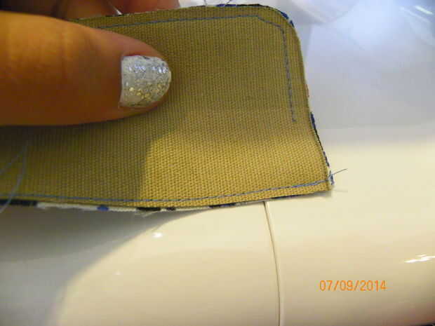 A continuación, vuelva al reves y coser por el borde para hacer limpia. Cosa en el panel frontal, justo sobre el bolsillo derecho lados juntos. ver fotos.