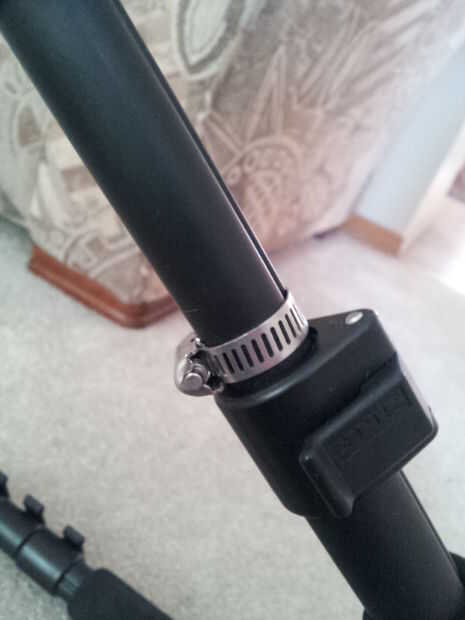 A continuación, vamos a añadir una abrazadera del engranaje a ese mismo pata que grabó. En la abrazadera de liberación superior de la pata del trípode, instale la abrazadera del engranaje 2 1/2-3 "encima de la abrazadera de liberación. Esto permite que el cable de bungie mantener la pierna cuando está en uso.