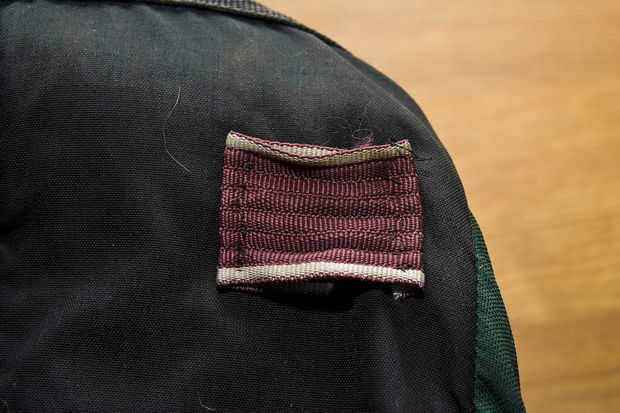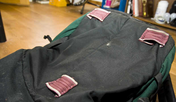 * (probablemente hará éste) remachado en una pieza de metal fino o de madera o algo en el interior de la bolsa. Esto también dará la bolsa más de un marco, si usted está preocupado acerca de la bolsa en sus ruedas.