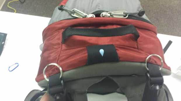 La mochila roja tiene muy limitada disponibilidad de sujeción en la parte superior y la mejor ubicación parece ser el accesorio de la correa de elevador de carga. Tenga en cuenta que he usado el llavero split anillos a través del lazo de apego de elevador de carga para no afectar a la función de las correas del elevador de carga. El panel se conecta luego con los mosquetones (LW) ligero a través de los gromets en el final deseado.