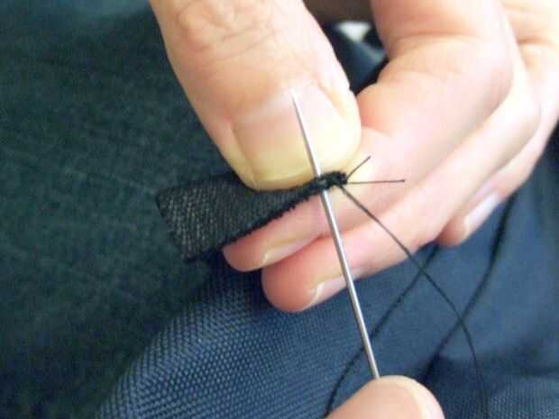 a continuación, tenemos que evitar entonces los extremos de la cinta de desgaste. Lo hice por enhebrar la aguja con el hilo normal y atar los extremos juntos, hacer un hilo doble. Un nudo otra vez para dejar de tirar a través de la cinta y luego empuje la aguja a través de la cinta del bajo lateral, sobre dos montículos de finales. Seguir haciendo esto a lo largo del final de la cinta y el elenco de atar un nudo.